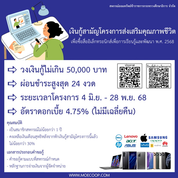 การให้เงินกู้สามัญโครงการส่งเสริมคุณภาพชีวิตเพื่อซื้อสื่ออิเล็กทรอนิกส์เพื่อการเรียนรู้และพัฒนา พ.ศ. 2568 Post published:30 พฤษภาคม 2025 Post category:เรื่องที่น่าสนใจ รายละเอียดประกาศ >>> การให้เงินกู้สามัญโครงการส่งเสริมคุณภาพชีวิตเพื่อซื้อสื่ออิเล็กทรอนิกส์เพื่อการเรียนรู้และพัฒนา พ.ศ. 2568 You Might Also Like ประกาศ สอ.ศธ. ระเบียบว่าด้วยการให้สวัสดิการเพื่อสงเคราะห์เกี่ยวกับการศพของสมาชิก พ.ศ. 2567 5 กันยายน 2024 ข่าวประชาสัมพันธ์ ประจำเดือนเมษายน 2569 31 มีนาคม 2026 สอ.ศธ. ร่วมบำเพ็ญกุศลปัณรสมวาร (15 วัน) ถวายเป็นพระราชกุศลแด่สมเด็จพระนางเจ้าสิริกิติ์ พระบรมราชินีนาถ พระบรมราชชนนีพันปีหลวง 7 พฤศจิกายน 2025