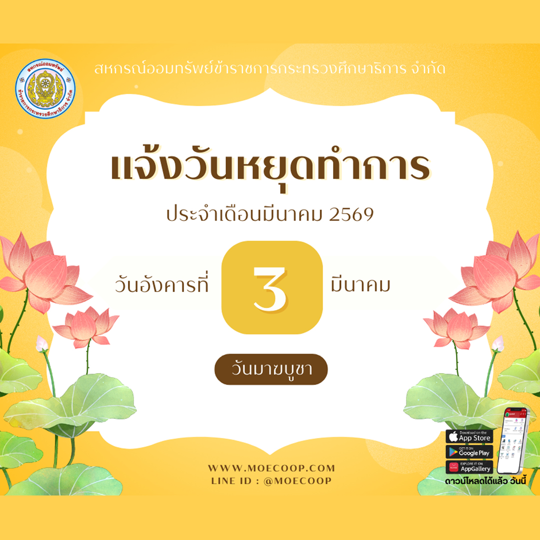 2. สอ.ศธ. จ่ายเงินปันผล ร้อยละ 5.25 และเงินเฉลี่ยคืน ร้อยละ 21.00 ประจำปี 2568 โดยนำเข้าบัญชีเงินฝากของสมาชิกที่แจ้งความประสงค์ไว้กับสหกรณ์เรียบร้อยแล้ว สอบถามรายละเอียดปันผลได้ที่ Line ID : @moecoop