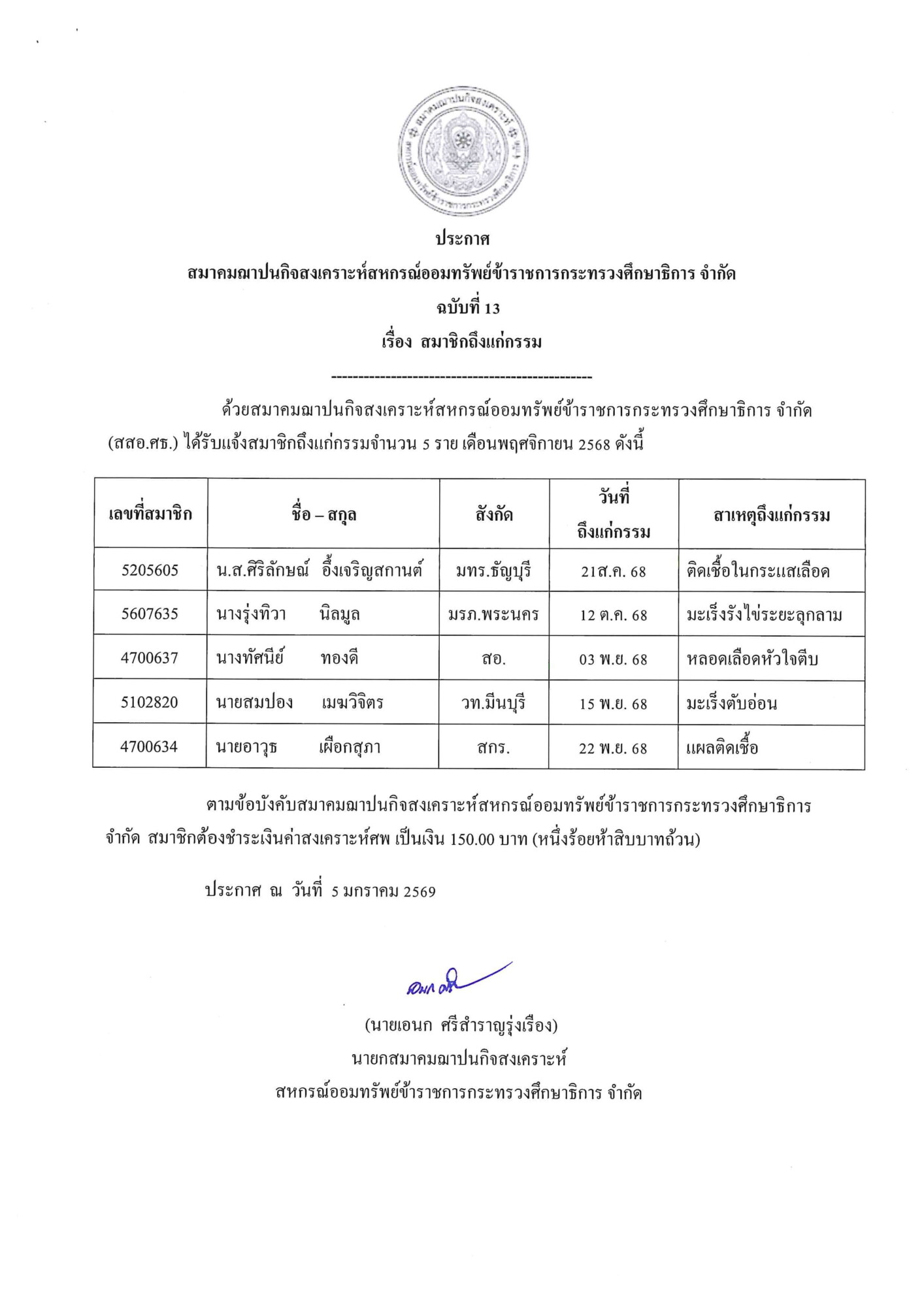 ประกาศ ฉบับที่ 13 เรื่อง สมาชิกถึงแก่กรรม Post published:30 ธันวาคม 2025 Post category:ประกาศ / สมาคม You Might Also Like ประกาศ ฉบับที่ 5 เรื่อง สมาชิกถึงแก่กรรม 13 พฤษภาคม 2025 ประกาศ เรื่อง การกำหนดวันหยุดตามประเพณีของเจ้าหน้าที่สหกรณ์ ประจำปี 2569 15 ธันวาคม 2025 ประกาศ ฉบับที่ 6 เรื่อง สมาชิกถึงแก่กรรม 29 พฤษภาคม 2025