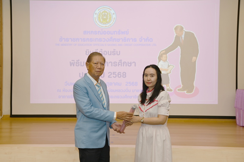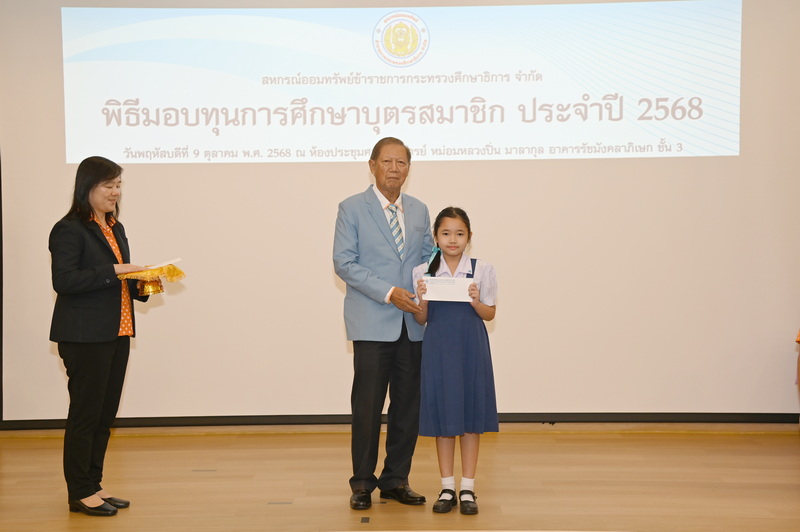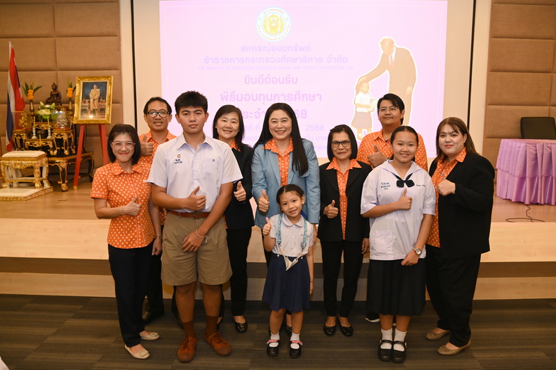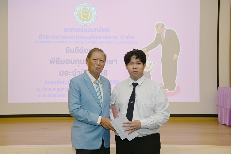 ว่าที่ ร.ต. จรูญ ชูลาภ ประธานกรรมการสหกรณ์ออมทรัพย์ข้าราชการกระทรวงศึกษาธิการ จำกัด (สอ.ศธ.) นายวิโรจน์ ใจอารีรอบ รองประธานกรรมการ นายพูลลาภ อินทรนัฎ รองประธานกรรมการ นางสมจิตร ธัมวิสุทธิวรากร ผู้จัดการ พร้อมด้วยกรรมการดำเนินการ ที่ปรึกษา กรรมการฝ่ายสวัสดิการ และเจ้าหน้าที่ จัดพิธีมอบทุนการศึกษาบุตรสมาชิก ประจำปี 2568 เมื่อวันที่ 9 ตุลาคม 2568 ณ ห้องประชุมศาสตราจารย์ หม่อมหลวงปิ่น มาลากุล อาคารรัชมังคลาภิเษก ชั้น 3 กระทรวงศึกษาธิการ กรุงเทพมหานคร