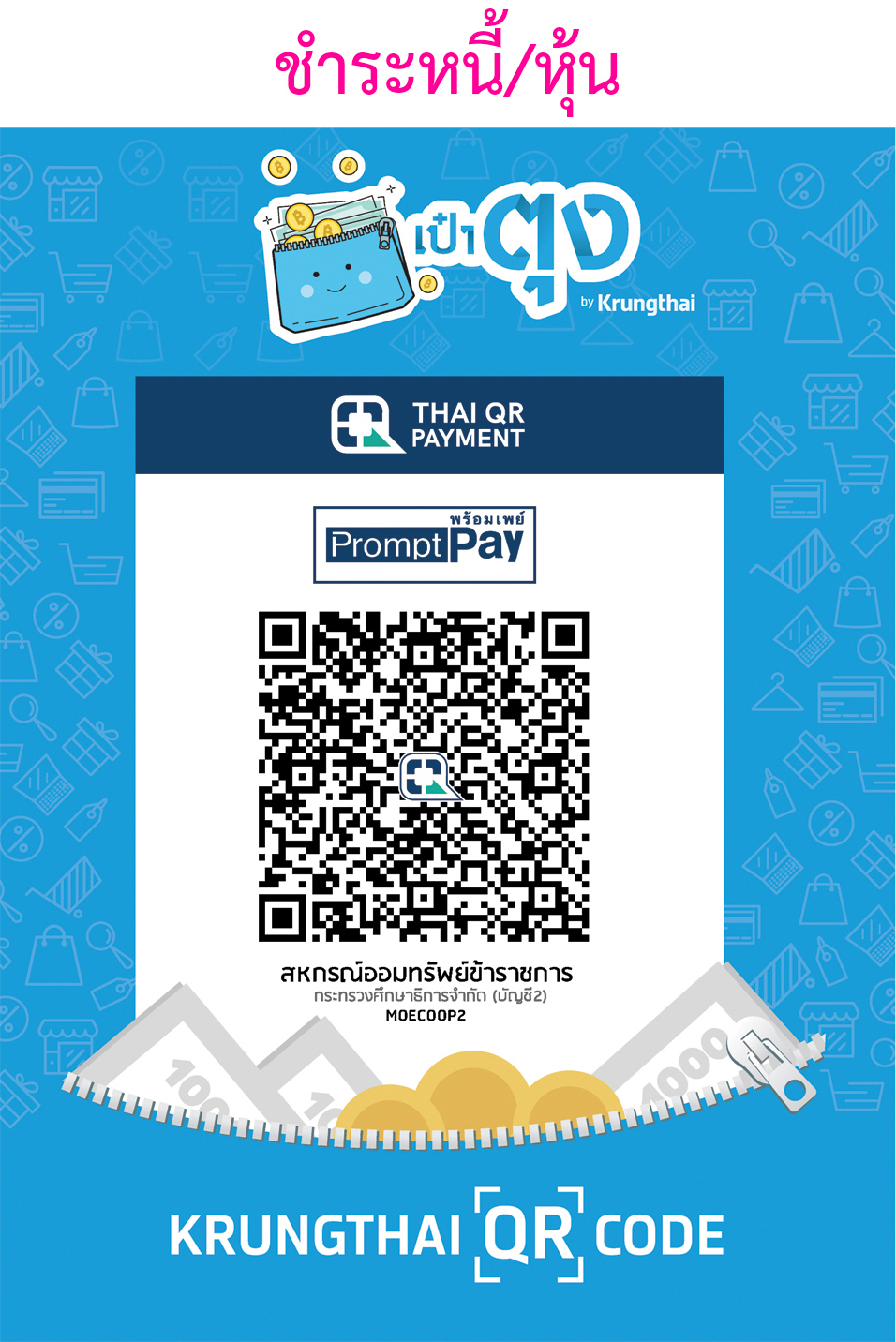 – กรณีฝากเงิน/ชำระหนี้/หุ้น ผ่าน QR CODE หรือผ่านธนาคารกรุงไทย จำกัด (มหาชน) สาขา : กระทรวงศึกษาธิการ ประเภท : ออมทรัพย์ ชื่อบัญชี : สหกรณ์ออมทรัพย์ข้าราชการกระทรวงศึกษาธิการ จำกัด บัญชีรับฝากเงิน เลขที่ 059-1-05580-5 และบัญชีชำระหนี้/หุ้น เลขที่ : 059-1-26195-2 เมื่อดำเนินการโอนแล้วกรุณาแจ้ง ชื่อ-นามสกุล / เลขสมาชิก / จำนวนเงินที่โอน / เบอร์โทร ให้เจ้าหน้าที่ฝ่ายสินเชื่อ/การเงินทราบก่อนเวลา 15.30 น. ในที่ทำการโอนเงิน