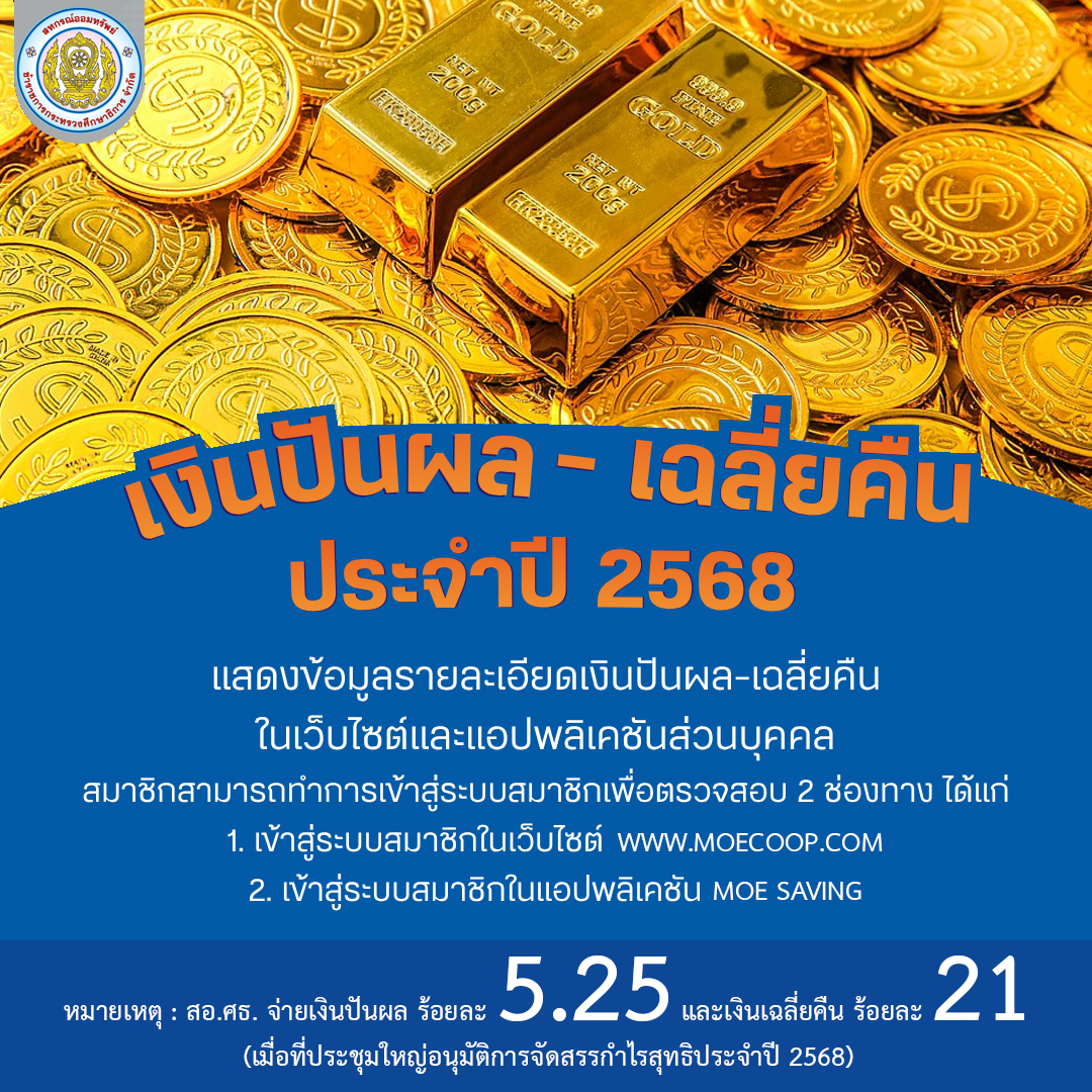 1. ขอเชิญชวนสมาชิกสหกรณ์ออมทรัพย์ข้าราชการกระทรวงศึกษาธิการ จำกัด (สอ.ศธ.) เข้าร่วมการประชุมใหญ่สามัญประจำปี 2568 ในวันเสาร์ที่ 14 กุมภาพันธ์ 2569 ตั้งแต่เวลา 08.00 – 14.00 น. ณ บริเวณหอประชุมคุรุสภา กระทรวงศึกษาธิการ พร้อมเลือกตั้งตำแหน่ง กรรมการดำเนินการ ชุดที่ 45 สอ.ศธ. จ่ายค่ารับรองสมาชิก คนละ 1,400 บาท และนำเงินเข้าบัญชีอีก 100 บาท รวมเป็นเงินทั้งสิ้น 1,500 บาท (หนึ่งพันห้าร้อยบาทถ้วน) ซึ่ง สอ.ศธ. จ่ายเงินปันผล 5.25% และเงินเฉลี่ยคืน 21% (เมื่อที่ประชุมใหญ่อนุมัติการจัดสรรกำไรสุทธิประจำปี 2568)