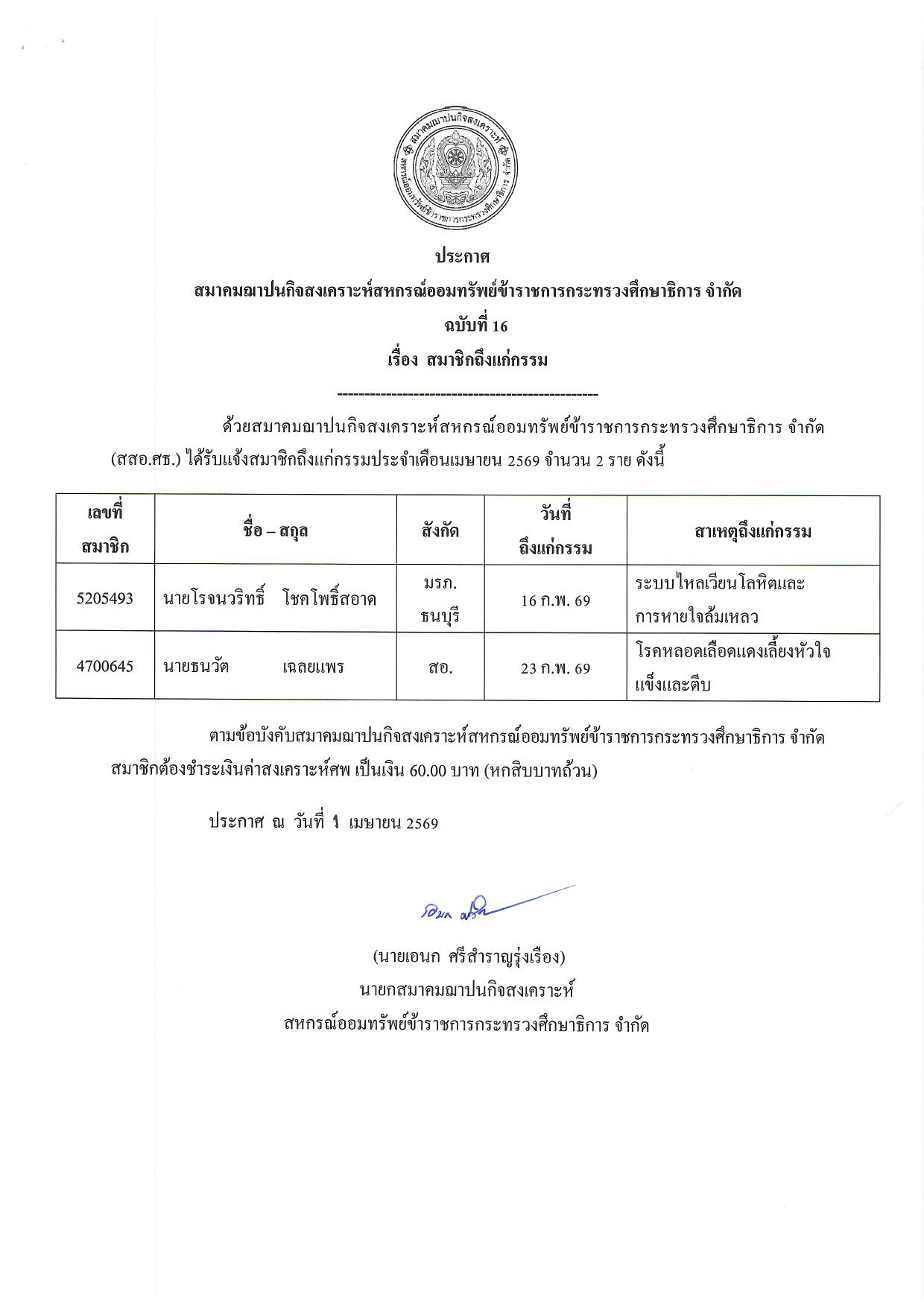 ประกาศ ฉบับที่ 16 เรื่อง สมาชิกถึงแก่กรรม Post published:31 มีนาคม 2026 Post category:ข่าวสหกรณ์ฯ / ประกาศ / สมาคม You Might Also Like รายงานกิจการ 17 ธันวาคม 2024 ประกาศ ฉบับที่ 11 เรื่อง สมาชิกถึงแก่กรรม 28 ตุลาคม 2025 ประกาศ ฉบับที่ 6 เรื่อง สมาชิกถึงแก่กรรม 29 พฤษภาคม 2025