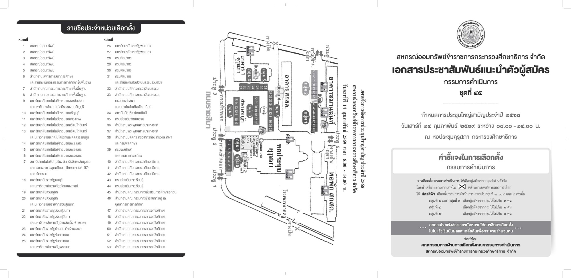 1. โปรดนำบัตรประชาชน  หรือ บัตรข้าราชการ หรือ บัตรที่ทางราชการออกให้ หรือ บัตรสมาชิก สอ.ศธ. มาด้วย เพื่อลงทะเบียนและใช้สิทธิเลือกตั้ง