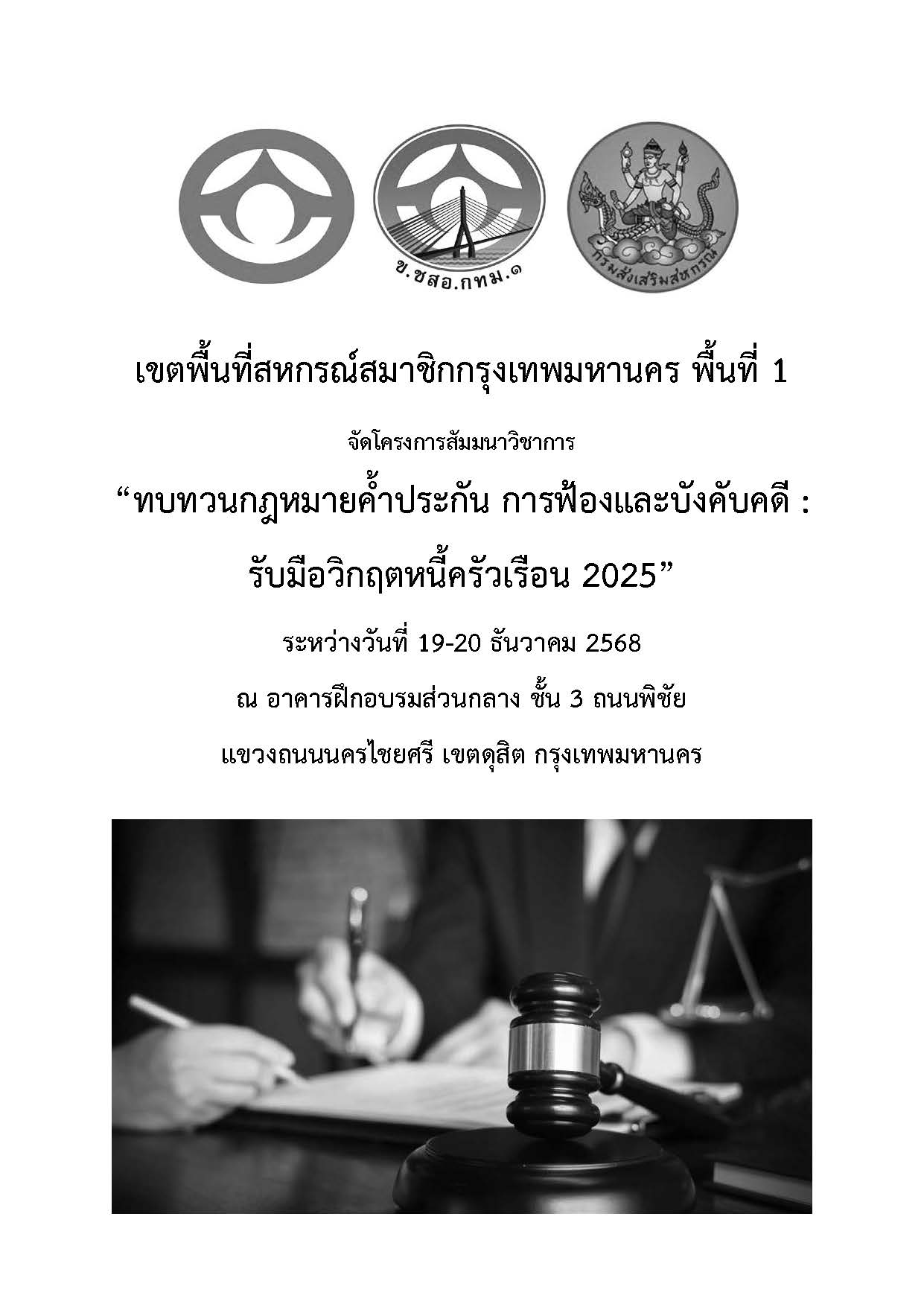 เขตพื้นที่สหกรณ์สมาชิกกรุงเทพมหานคร พื้นที่ 1 (ข.ชสอ.กทม.1) ร่วมกับชุมนุมสหกรณ์ออมทรัพย์แห่งประเทศไทย จำกัด (ชสอ.) และสำนักงานส่งเสริมสหกรณ์กรุงเทพมหานคร พื้นที่ 1 (สสพ.1) จัดโครงการสัมมนาวิชาการ “ทบทวนกฎหมายค้ำประกัน การฟ้องและบังคับคดี : รับมือวิกฤตหนี้ครัวเรือน 2025” ระหว่างวันที่ 19-20 ธันวาคม 2568 ณ อาคารฝึกสัมมนาส่วนกลาง ชั้น 3 ถนนพิชัย แขวงถนนนครไชยศรี เขตดุสิต กรุงเทพมหานคร